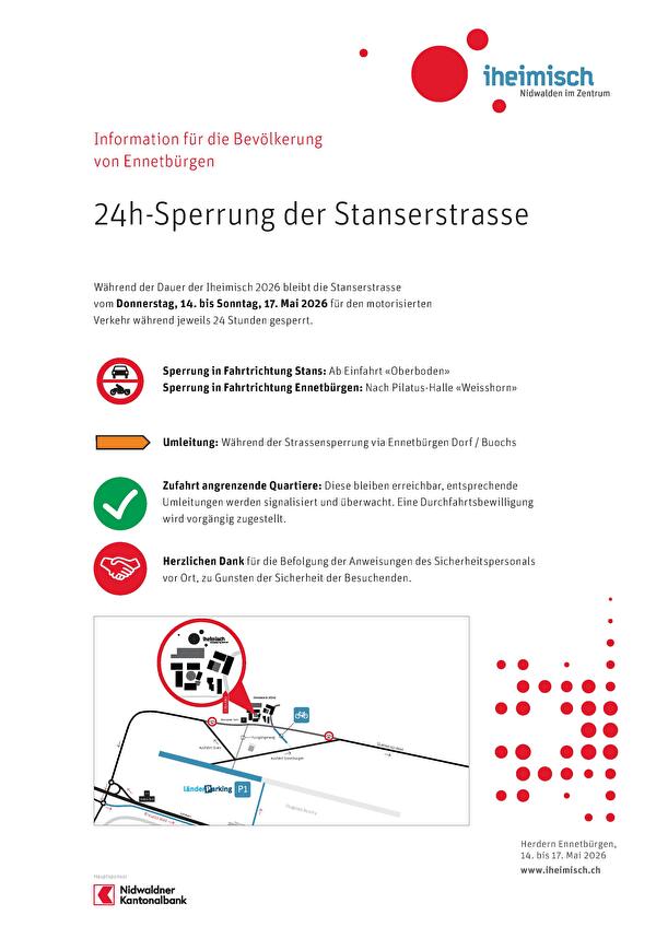 Aufgrund der Gewerbeausstellung Iheimisch wird die Stanserstrasse ab der Einfahrt "Oberoden" bis zur Pilatus-Halle "Weisshorn" vom Donnerstag, 14. Mai 2026 bis Sonntag, 17. Mai 2026 für den motorisierten Verkehr gesperrt.
