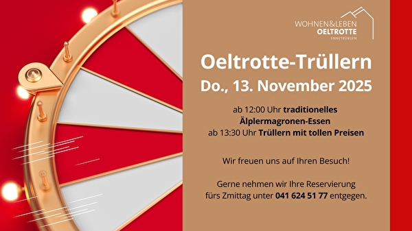 Die Begegnungsgruppe und das Alterszentrum Oeltrotte organisieren am Donnerstag, den 13. November 2025 um 13:30 Uhr das traditionelle "Trüllern" in der Cafeteria. Tolle Preise sind garantiert. Ab 12:00 Uhr gibt es ein leckeres Älplermagronen-Essen. Gerne nehmen wir Reservierung unter 041 624 51 77 entgegen. Wir freuen uns über Ihren Besuch!